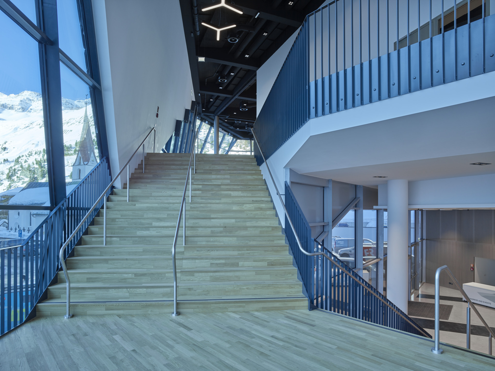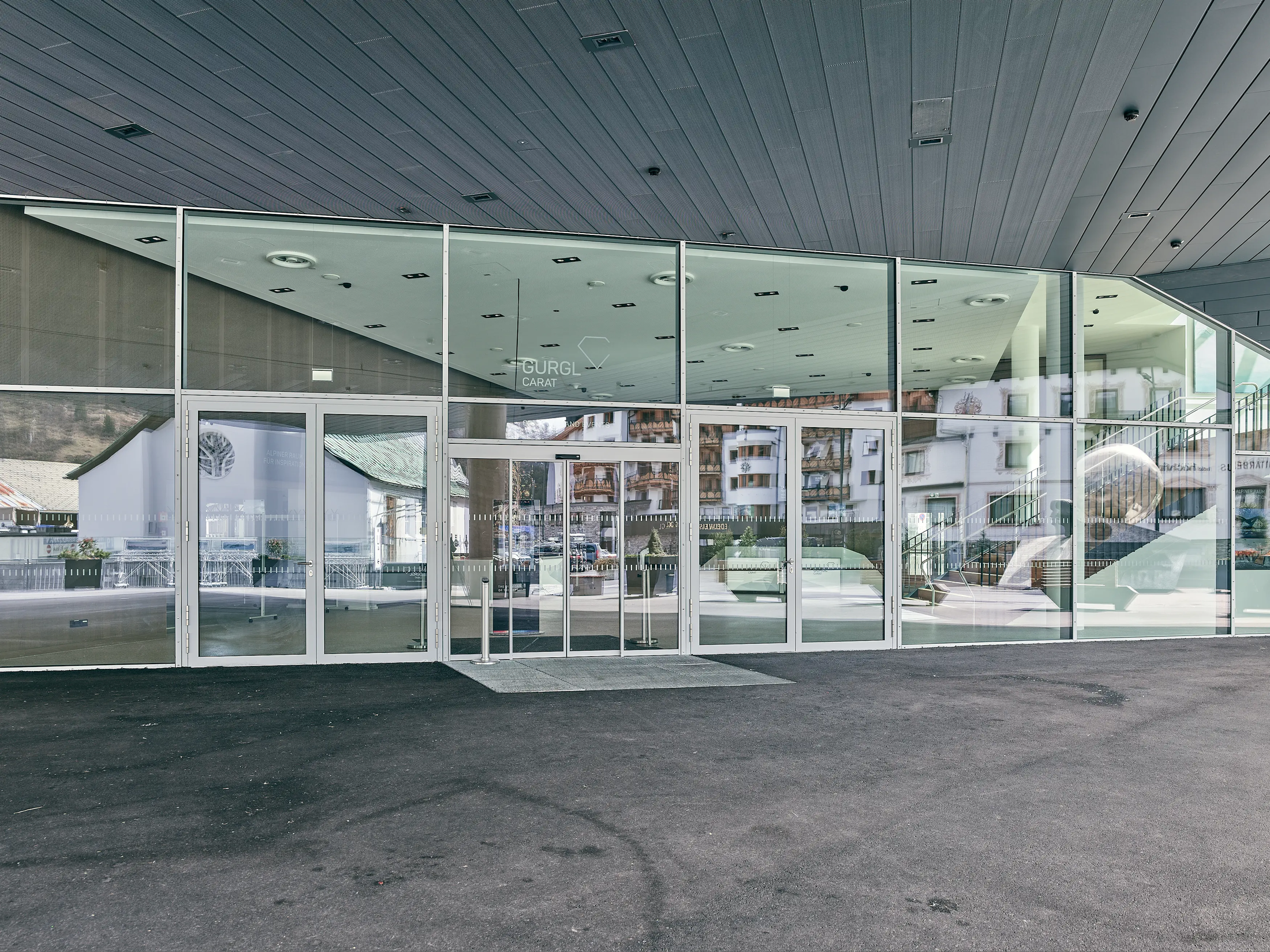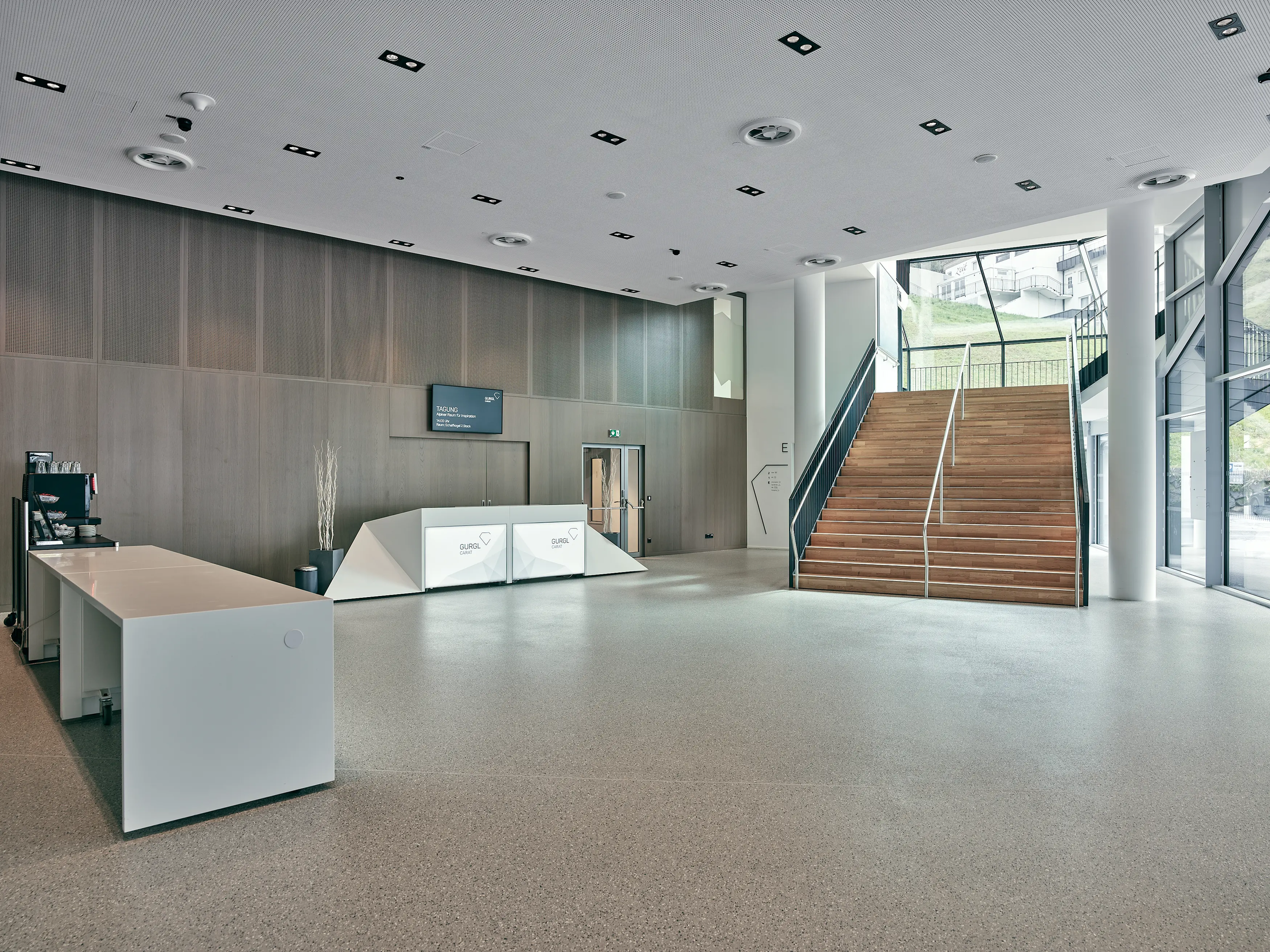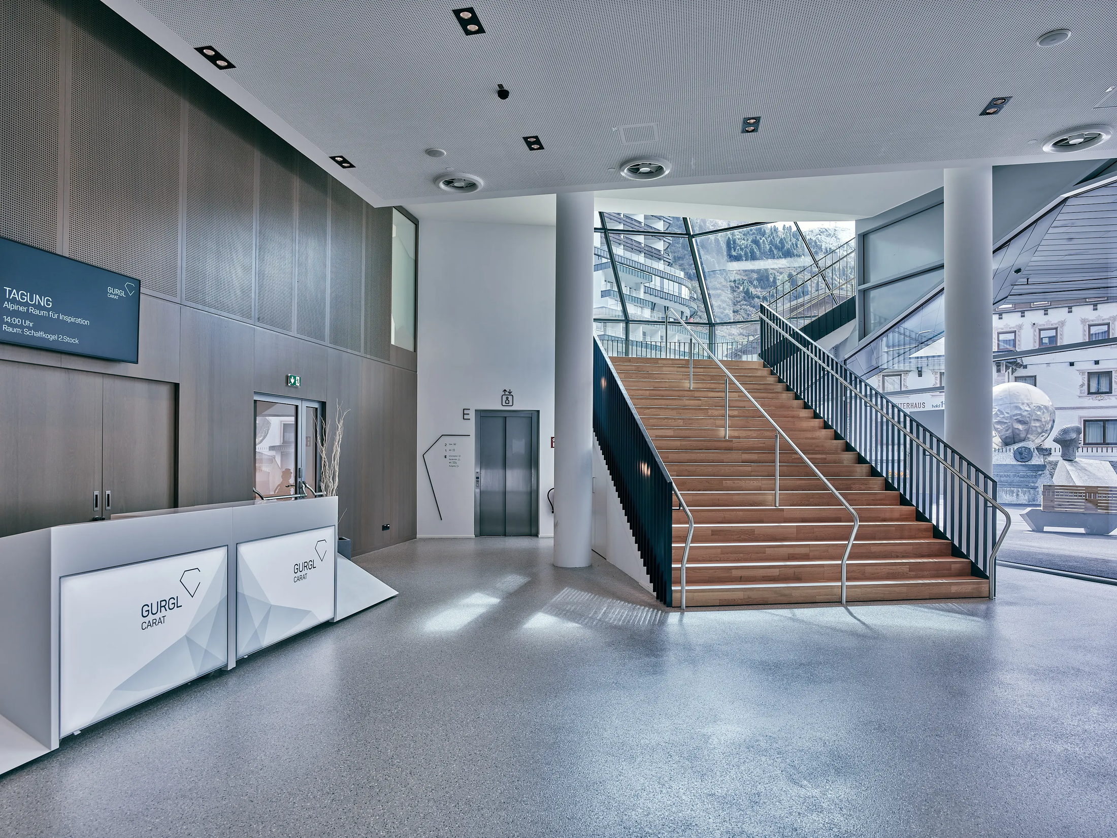 Das großzügig und offen gestaltete Foyer des Gurgl Carat bereitet einen Empfang auf höchstem Niveau. Dank großer Fensterfronten und geradliniger Architektur kommt die Lage mitten in der Tiroler Bergwelt hervorragend zur Geltung. Der Empfangsbereich des Kongresszentrums bietet genügend Platzt für eine Garderobe und ein eigenes Veranstalterbüro. Das Foyer kann mit einem fix installierten Zelt um einen großen Außenbereich erweitert werden und bietet so noch mehr Raum für einen großen Empfang, eine Ausstellung oder die Gästeregistrierung. Durch 6 mobile Counter mit Branding-Möglichkeit und 3 fest installierte Fernseher werden alle Gäste bestmöglich im jeweiligen Corporate Design begrüßt.